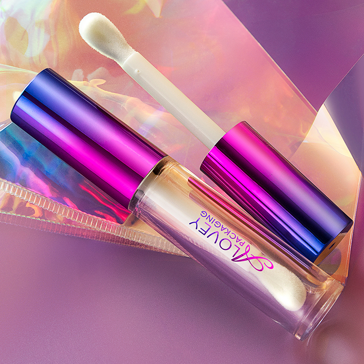 Custom lip gloss tubes with purple metallization cap,it is designed to combine functionality with eye-catching aesthetics, these tubes are perfect for premium lip gloss formulations.
